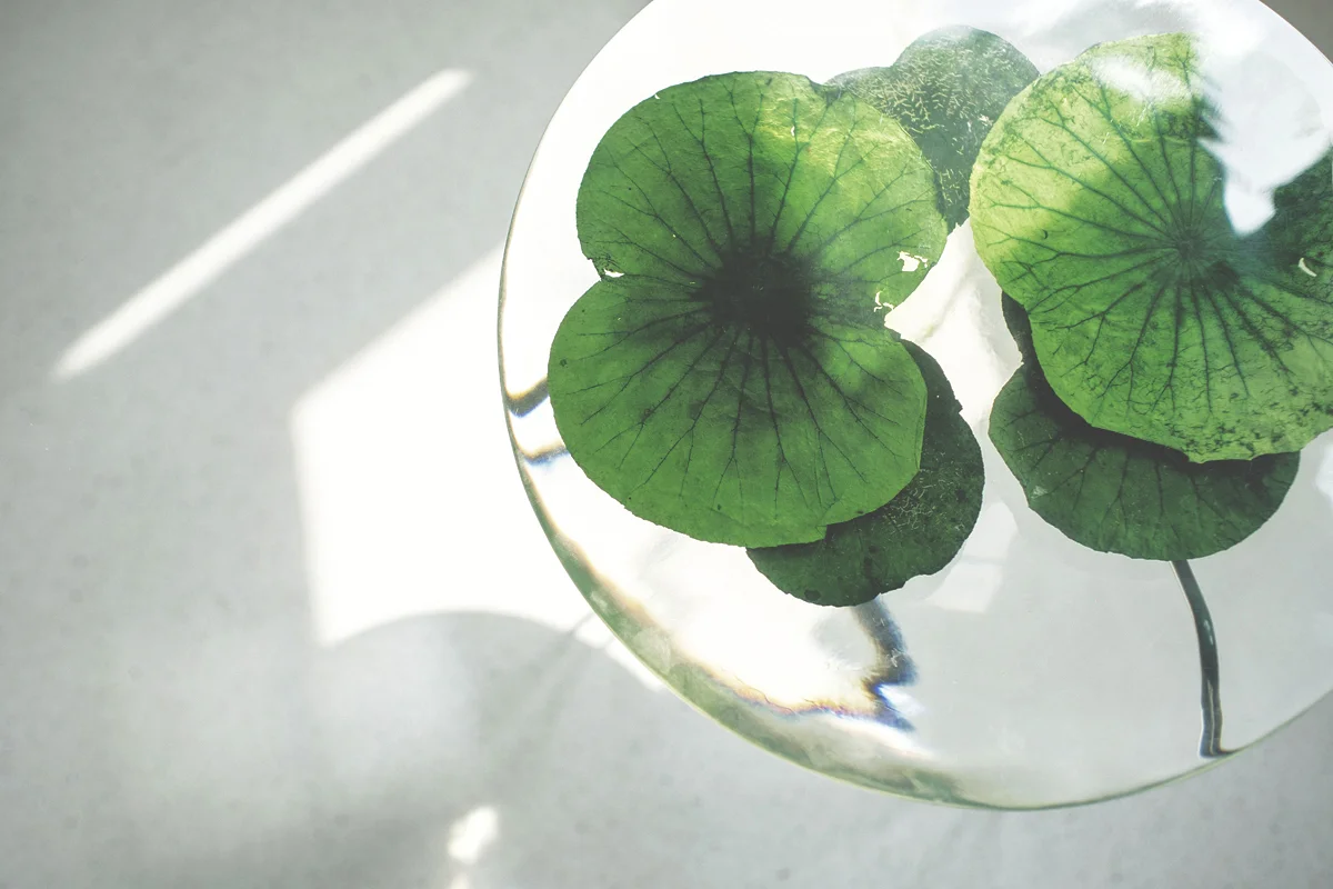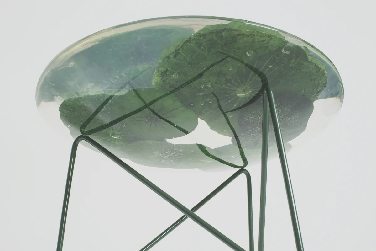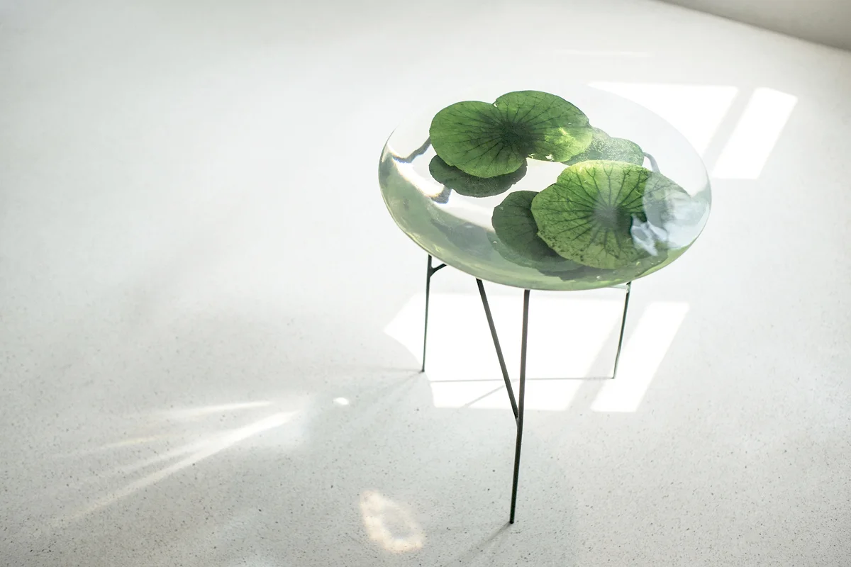 Float is a coffee table designed to be an exquisite illusion for the home. It appears as a levitating lotus pond supported by a trio of intertwining stems. Each table is unique, containing an arrangement of lotus leaves sourced from South East Asia. Behaving like a giant plano-convex lens, Float creates some surprising optical and visual effects. Everyday becomes a magical affair, as reality appears to distort around this table.